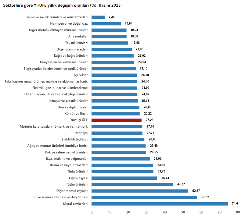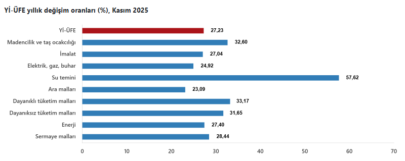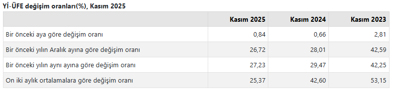 TÜİK üretici fiyat endeksi verisini açıkladı. Yİ-ÜFE (2003=100) 2025 yılı Kasım ayında bir önceki aya göre yüzde 0,84 artış, bir önceki yılın Aralık ayına göre yüzde 26,72 artış, bir önceki yılın aynı ayına göre yüzde 27,23 artış ve on iki aylık ortalamalara göre yüzde 25,37 artış gösterdi.